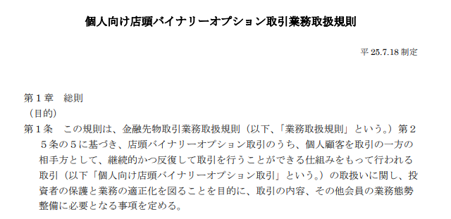 出典:一般社団法人金融先物取引業協会(FFAJ)「個人向け店頭バイナリーオプション取引業務取扱規則 」(PDF) 結果、国内業者には以下の規制が導入されました。
