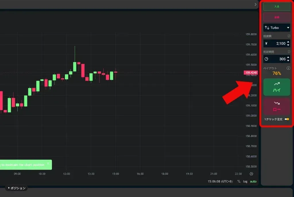 チャートの動きに慣れてきたら、Turboの30秒・45秒にチャレンジしてみてください。ただ、まずはハイローで取引の基本を身につけてからの方が、変な負け癖がつきにくいと思います。